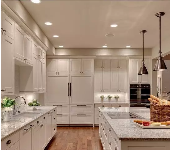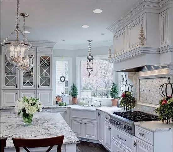 所以,如果櫥柜做到頂要滿足空間感及美觀的一般是廚房空間比較大,甚至是開放式廚房,設(shè)計(jì)層次感較多,相對復(fù)雜一點(diǎn),并且很少會(huì)有現(xiàn)代風(fēng)格的,如下圖: